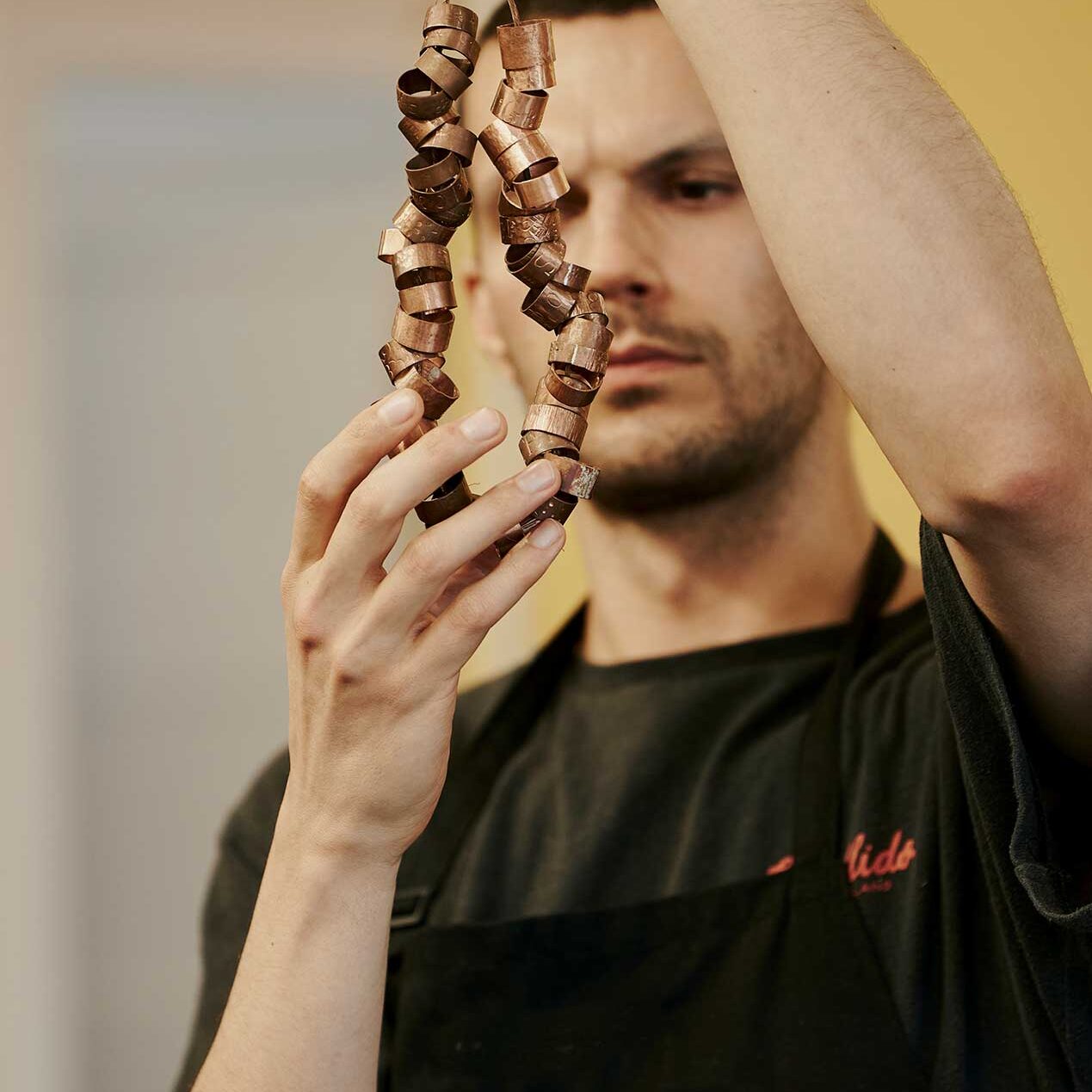 Working mainly in metal, the outcomes are inextricably connected with how the pieces are constructed. Playing with scale, structure and surface treatments, there is a common thread of repetition throughout her works. Her pieces reference traditional jewellery while simultaneously siting machinery, architecture and crystalline or geological forms.